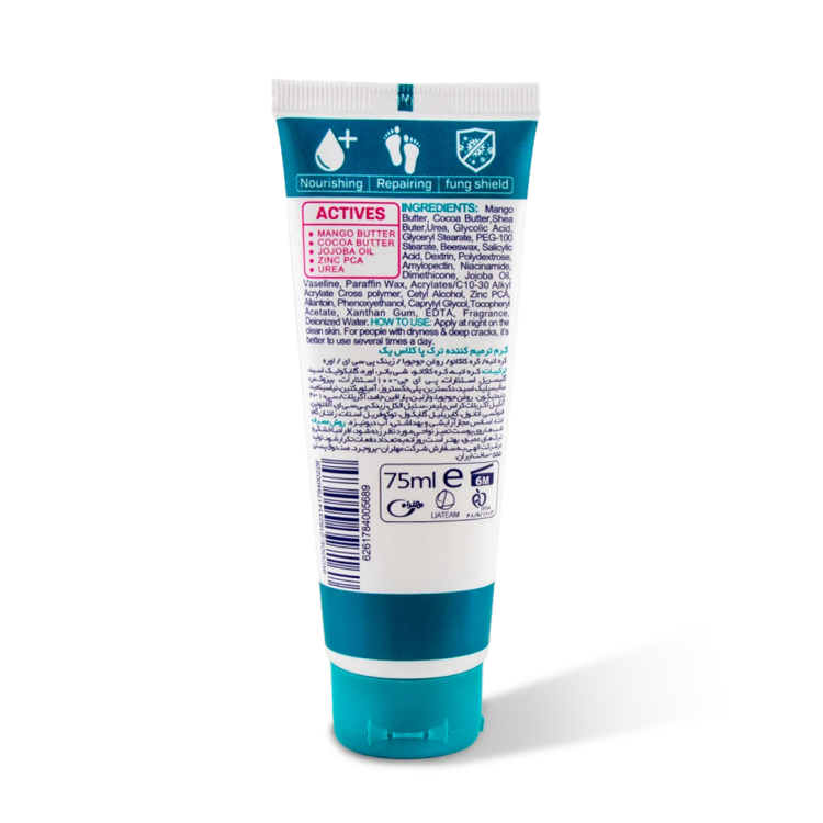 ترمیمکننده ترکهای پا، آبرسان و بهبوددهنده خشکی پوست پا، نرمکننده عالی و مغذی پوست، ضد التهاب و جلوگیری از عفونتهای قارچی، لایهبرداری ملایم و حذف سلولهای مرده پوست