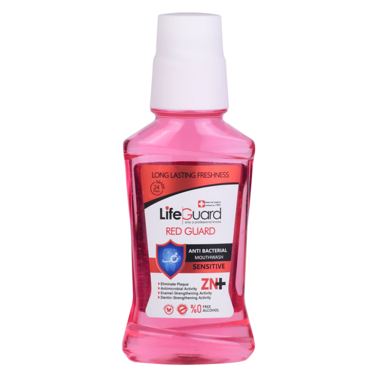 دهانشویه بزرگسال حساس (Red Guard) برند لایف گارد، به واسطه بهرهمندی از مواد مؤثرهای همچون زینک و CPC (ستیل پریدینیوم کلراید)، ویژگیهای ارزشمند دیگری را به شرح زیر برای سلامت دهان و دندان شما به ارمغان میآورد: