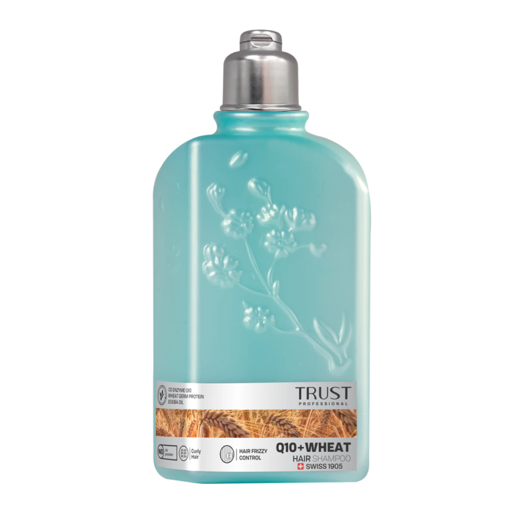 شامپو سر جوانه گندم و Q10 تراست، با داشتن پروتئین جوانه گندم، روغن جوجوبا و کوآنزیم کیوتن، از وز شدن تارهای موی شما جلوگیری کرده و حالت فر موهای شما را حفظ میکند. همچنین با استفاده از این محصول، تارهای مو و پوست سرتان آبرسانی شده و از خشکی آنها جلوگیری میشود.